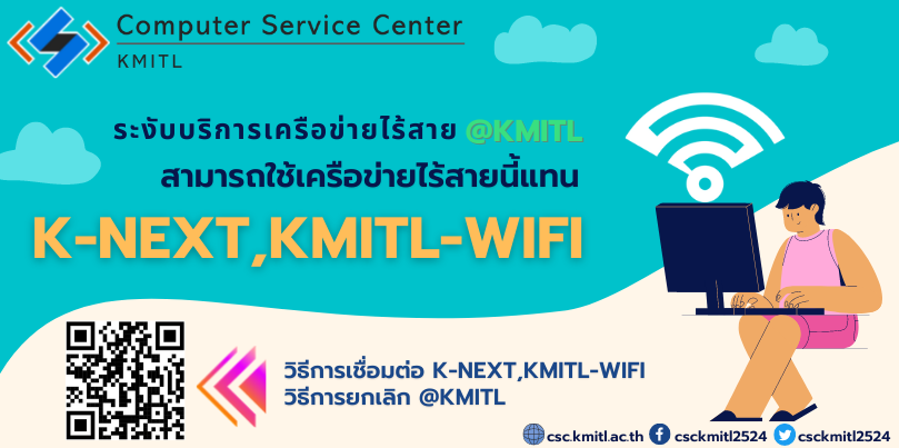 ตามที่สำนักบริการคอมพิวเตอร์ได้ระงับการใช้งานระบบเครือข่ายไร้สาย @KMITL ตั้งแต่วันที่ 1 พฤษภาคม 2564 นั้น ผู้ใช้งานสามารถใช้งาน เครือข่ายไร้สาย K-NEXT และ KMITL-WIFI ได้ตามปกติ สามารถเข้าดูวิธีการเชื่อมต่อ K-NEXT,KMITL-WIFI และวิธีการยกเลิกการเชื่อมต่อ @KMITL ได้ คลิกที่นี่