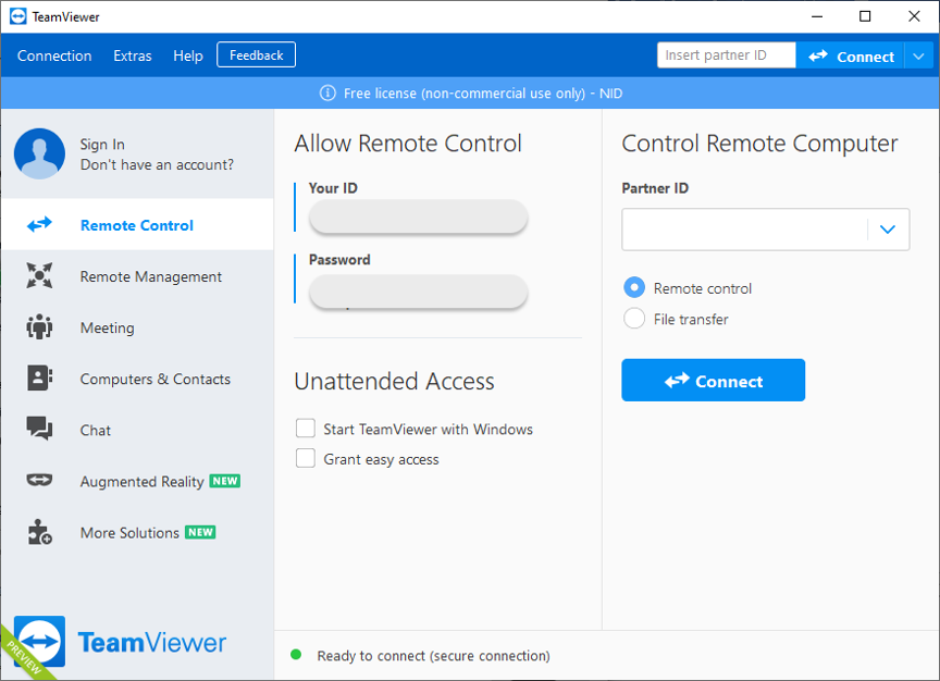 5. หน้าตาโปรแกรม TeamViewer จะแสดงดังภาพด้านล่าง
