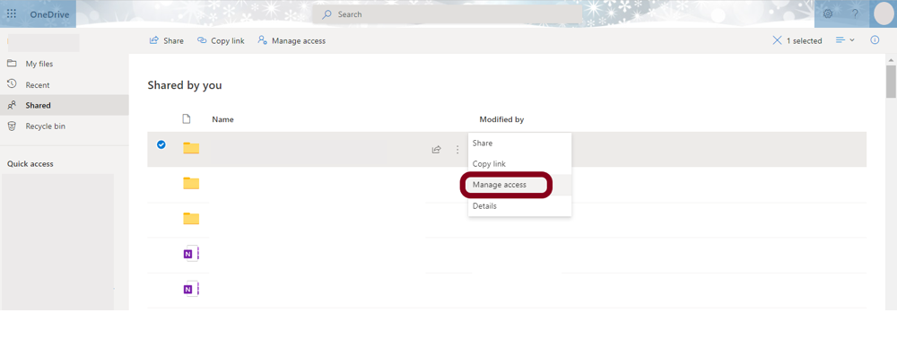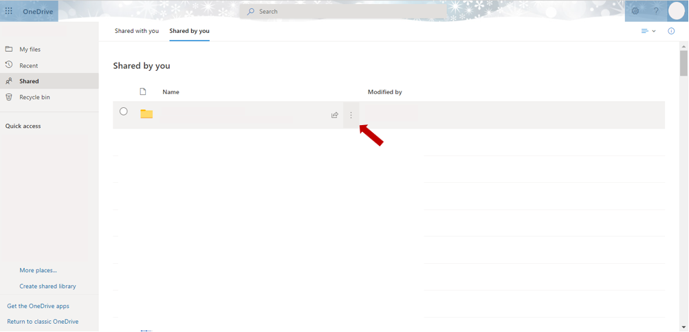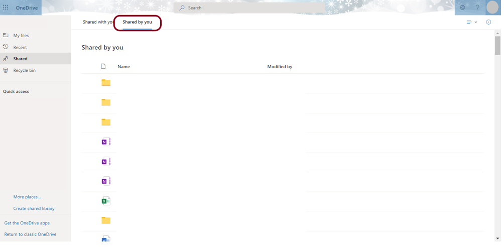 หลังจากที่คลิก Shared by you แล้ว จะพบไฟล์ทั้งหมดบน OneDrive ที่ถูกแชร์โดยเจ้าของบัญชีที่ลงชื่อเข้าใช้โดยจะแบ่งออกเป็น 2 คอลัมภ์ คือ Name และ Modified by ผู้ใช้งานสามารถตรวจสอบการเข้าถึงไฟล์ได้โดยคลิกที่ Show actions
