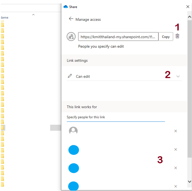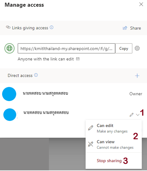 ผู้ใช้งานสามารถลบลิงก์ที่เคยแชร์ไว้ โดยคลิกที่ หมายเลข 1 หรือปรับเปลี่ยนการแก้ไขเป็นดูได้อย่างเดียว คลิกที่หมายเลข 2 และลบบุคคลที่ไม่ต้องการแชร์ในหมายเลข 3