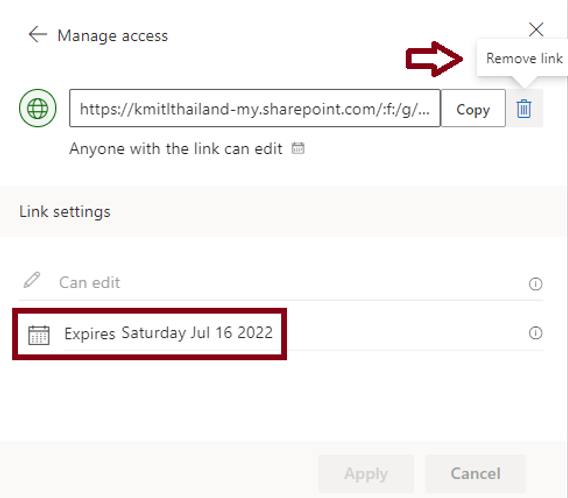 จากนั้น คลิกที่รูปถังขยะเพื่อทำการลบลิงก์ หรือตั้งค่าวันหมดอายุของลิงก์ตามกรอบสีแดงด้านล่าง ตามภาพ