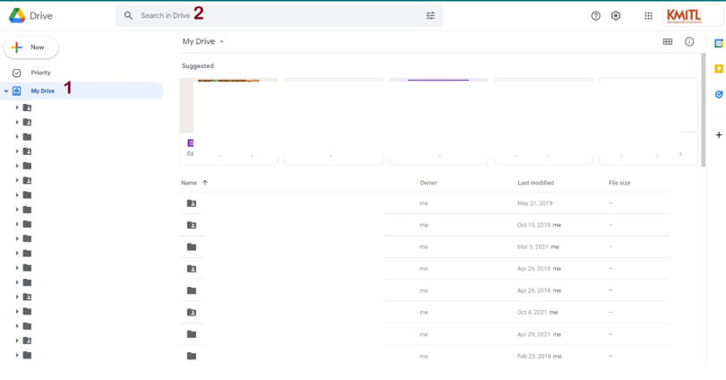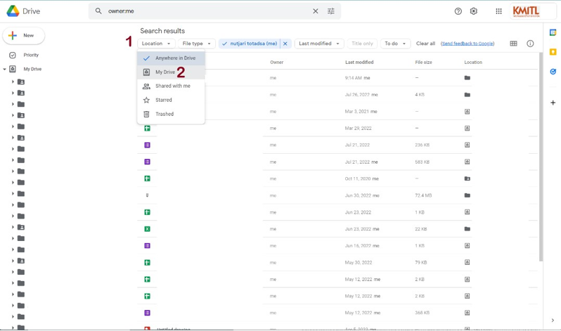 เมื่อลงชื่อเข้าใช้งาน https://drive.google.com/drive/my–drive แล้วคลิกที่ My Drive แผงเมนูมุมซ้ายบน ที่หมายเลข 1 จากนั้นพิมพ์อีเมลของตนเองหรือ พิมพ์ owner: me ที่ช่อง Search in Drive