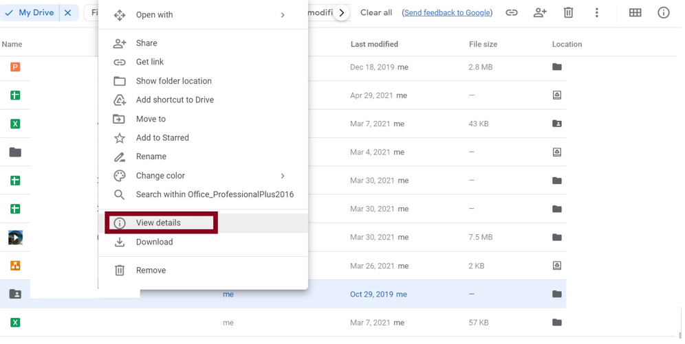 ผู้ใช้งานที่มีการเก็บข้อมูลบน Google Drive และมีการแบ่งปันไฟล์ สามารถตรวจสอบการแชร์จากไฟล์ของตนเอง ได้ที่เมนู My Drive → Search → Details ดังขั้นตอนด้านล่างนี้