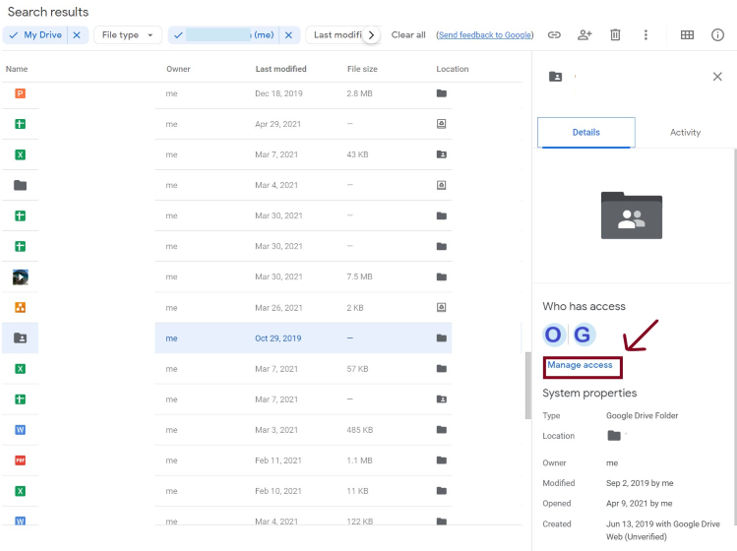 ระบบจะแสดงรายละเอียด ว่าเราได้แชร์ข้อมูลกับใคร ถูกแก้ไขล่าสุดคือใครและถูกเปิดอ่านล่าสุดคือใคร หากต้องการเปลี่ยนสิทธิ์การเข้าถึง ให้คลิกที่ Manage access ตามภาพด้านล่าง