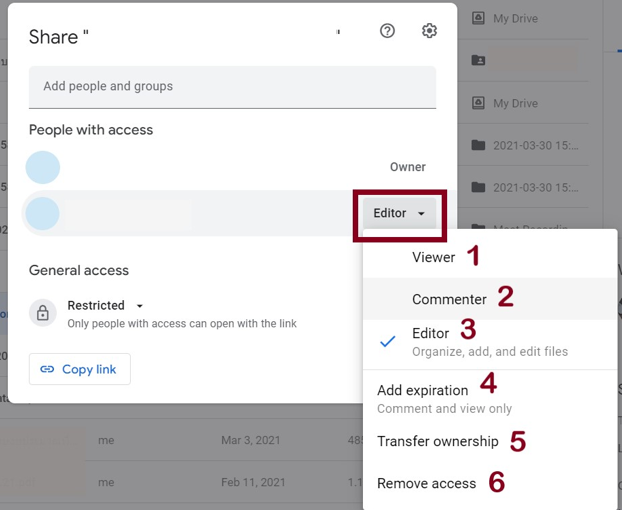 - Editor กำหนดให้ จัดเรียงย้ายตำแหน่ง เพิ่มไฟล์ แก้ไข เปลี่ยนชื่อไฟล์ได้ ลบจาก drive ผู้ถูกแชร์ได้แต่ไฟล์ ต้นฉบับยังคงอยู่ที่เจ้าของไฟล์