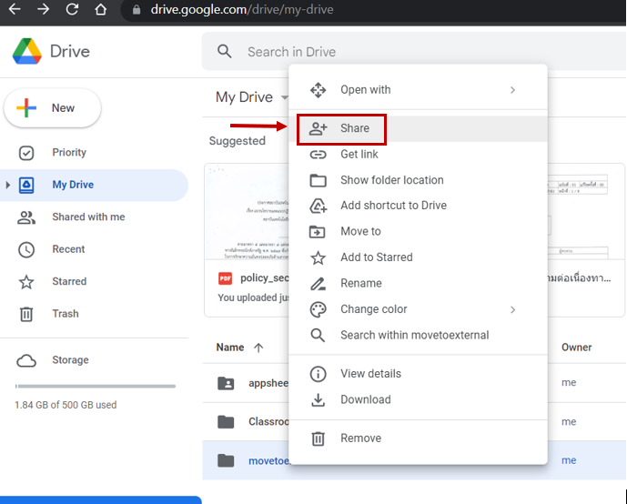 1. เมื่ออยู่ในหน้า Google Drive และรวบรวมไฟล์ทั้งหมดที่ต้องการจะคัดลอกไปยัง google account อื่น ไว้ในโฟลเดอร์แล้ว ให้คลิกขวาที่โฟลเดอร์ดังกล่าว จากนั้นคลิกแชร์