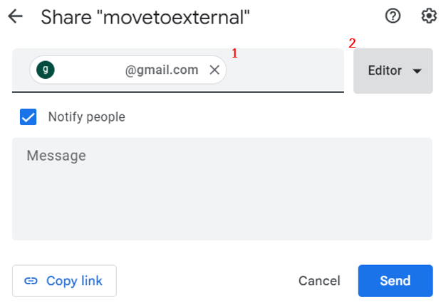 2. พิมพ์อีเมล์ปลายทางที่ต้องการจะคัดลอกข้อมูล จากนั้นเลือกสิทธิ์ Editor และคลิก Send