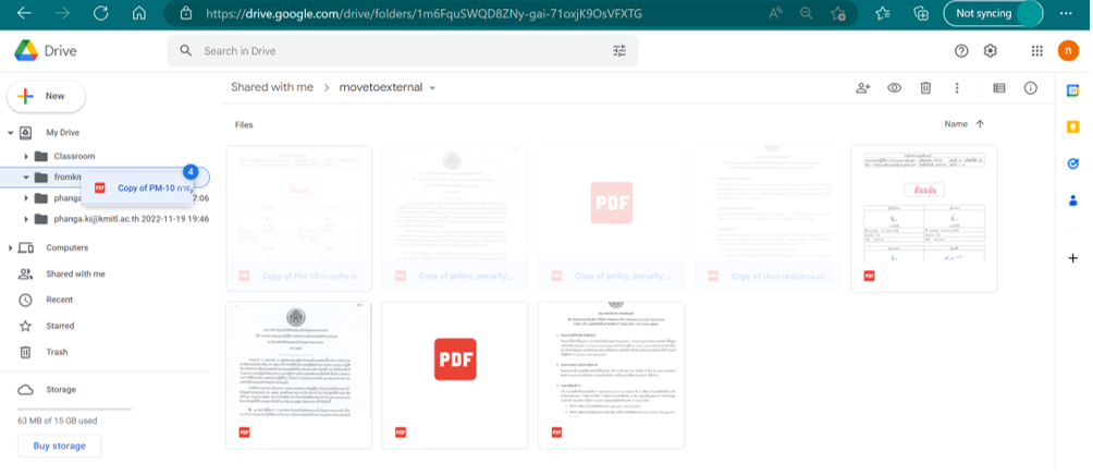 5. เมื่อระบบคัดลอกไฟล์เรียบร้อยแล้วชื่อไฟล์ที่ทำการคัดลอกทั้งหมดจะขึ้นต้นว่า Copy of ตามด้วยชื่อไฟล์ ให้ลากคลุมไฟล์ทั้งหมดจากนั้นลากไฟล์ที่คลุมไว้ย้ายไปยัง โฟลเดอร์ที่ต้องการใน My Drive ดังรูปด้านล่าง