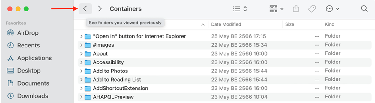 เมื่อถอนโปรแกรมแล้ว ให้นำโฟลเดอร์ที่เกี่ยวข้องออกจาก โฟลเดอร์ไลบรารี โดยกดปุ่ม Command + Shift + g พิมพ์ ~/Library ในช่องค้นหาแล้ว Enter จากนั้นไปที่โฟลเดอร์ Containers และลบโฟลเดอร์ด้านล่างนี้ที่อยู่ภายใต้โฟลเดอร์ Containers (อาจมีไม่ครบทุกโฟลเดอร์ให้ลบเฉพาะที่ระบบแสดงขึ้นมา)