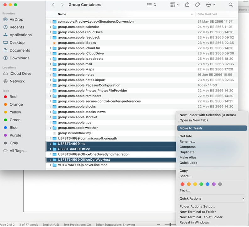 จากนั้นคลิกกลับมายังตำแหน่งโฟลเดอร์ Library ไปที่โฟลเดอร์ Group Containers และลบโฟลเดอร์ดังต่อไปนี้ ตามภาพด้านล่าง