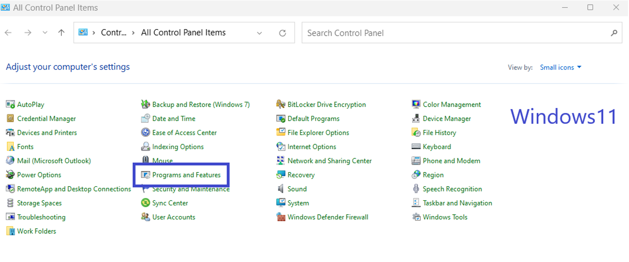 พิมพ์ Control Panel ในกล่องค้นหา (Search) บริเวณ Taskbar ด้านล่าง เมื่อเข้ามาที่หน้าต่าง Control Panel แล้ว ให้คลิกที่ Programs and Features