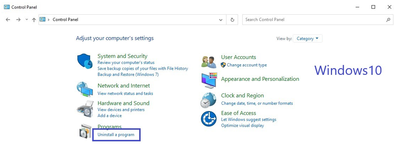 พิมพ์ Control Panel ในกล่องค้นหา (Search) บริเวณ Taskbar ด้านล่าง เมื่อเข้ามาที่หน้าต่าง Control Panel แล้ว ให้คลิกที่ Uninstall a program