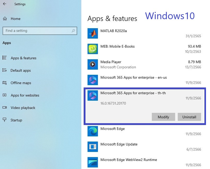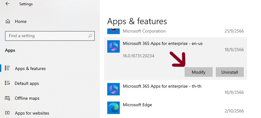 บริเวณ taskbar ด้านล่าง จากนั้นคลิกที่ Setting - คลิกที่เมนู Apps –> Installed apps –> เลือก Office Desktop ที่ได้ทำการติดตั้งไปใหม่ คลิกที่ more option (จุดสามจุด) จากนั้นคลิกที่ Modify ระบบจะถามการอนุญาตการดำเนินการ ให้คลิก Yes