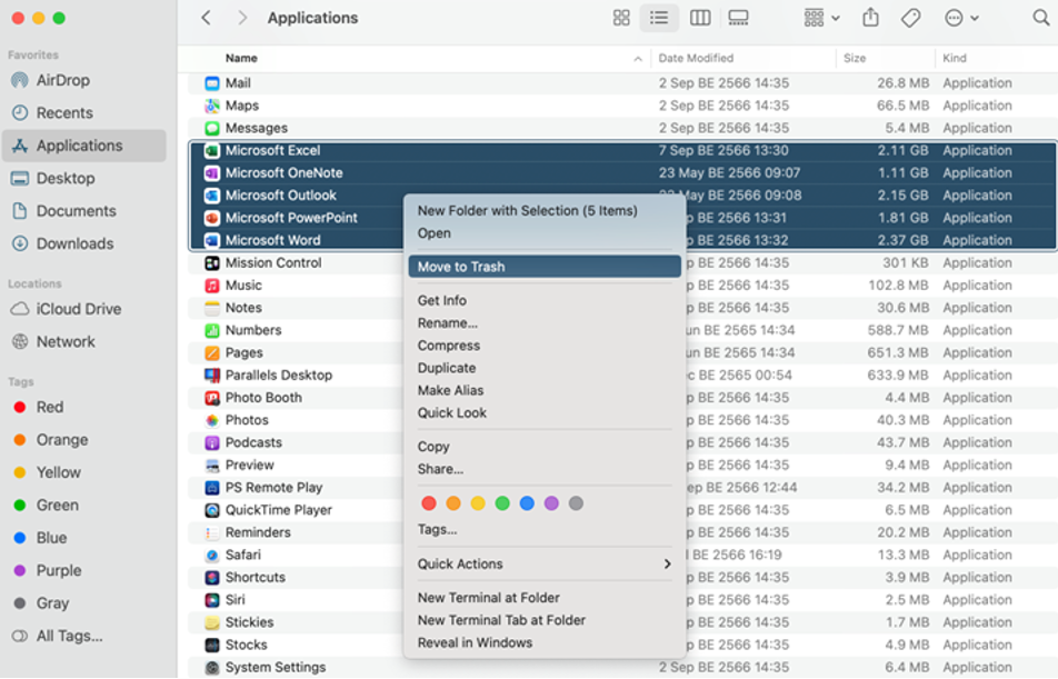 จากนั้นเริ่มถอนการติดตั้ง โดยให้ผู้ใช้งานเปิด Finder -> Application จากนั้นกดปุ่ม Command + คลิก Application Office ทั้งหมดจากนั้นคลิกขวา เลือก Move to Trash ตามภาพด้านล่าง