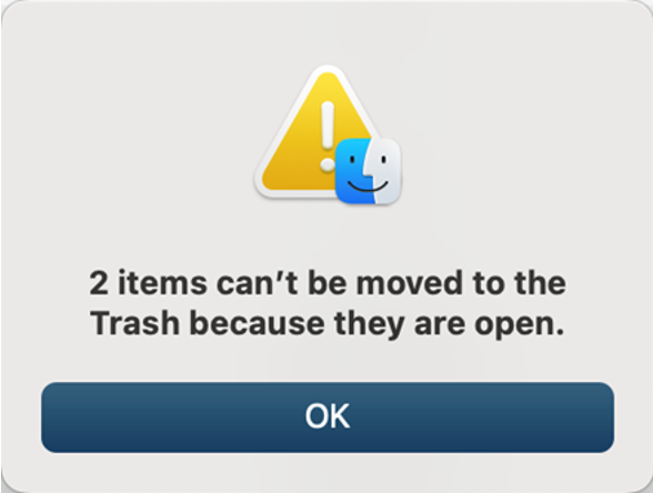 หากพบข้อความแจ้งเตือนดังภาพซ้ายด้านล่าง ให้ทำการ Quit Program ที่เปิดค้างไว้ตามภาพขวาด้านล่าง จากนั้นให้ทำการลบโปรแกรมใหม่อีกครั้ง
