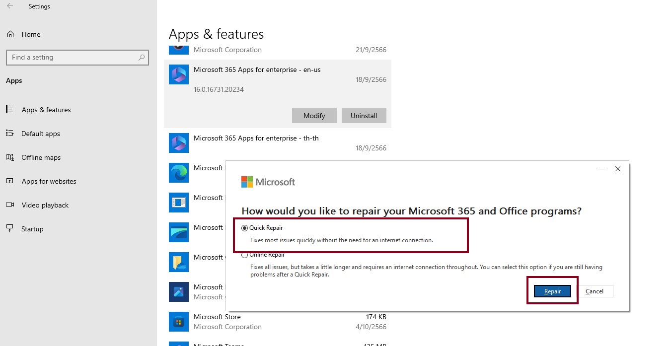 - เลือก Quick Repair จากนั้นคลิก Repair