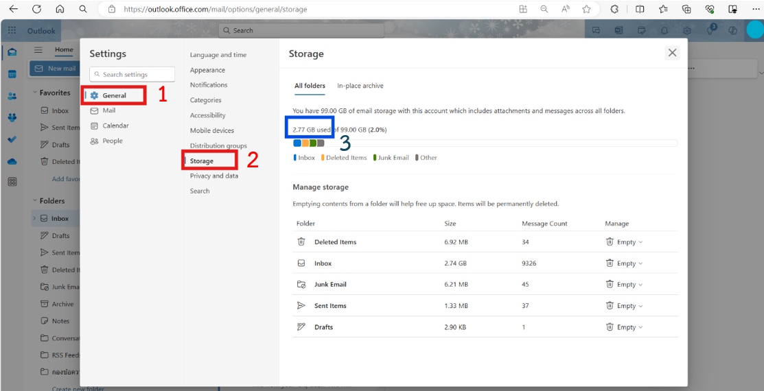 วิธีตรวจสอบพื้นที่ Outlook(email)ข่าวประชาสัมพันธ์, องค์ความรู้ หลังจากลงชื่อเข้าใช้งานที่ office.com ด้วยอีเมล์สถาบัน ให้คลิกทึ่ Outlook iconเมื่อเข้าสู่หน้า Outlook แล้วนั้นคลิกที่ gear icon บริเวณมุมบนขวามือเมื่อเข้าสู่หน้า Outlook settings แล้วให้คลิกที่แถบ General –> Storage การใช้งานพื้นที่จะถูกแสดงผลในส่วนนี้ ผู้ใช้งานสามารถจัดการพื้นที่จากการลบอีเมล์ที่ไม่จำเป็น เช่น Deleted Items, Junk Email หรือ Drafts เพื่อเป็นการลดพื้นที่ด้วยตัวท่านเอง update on 18 June 2024