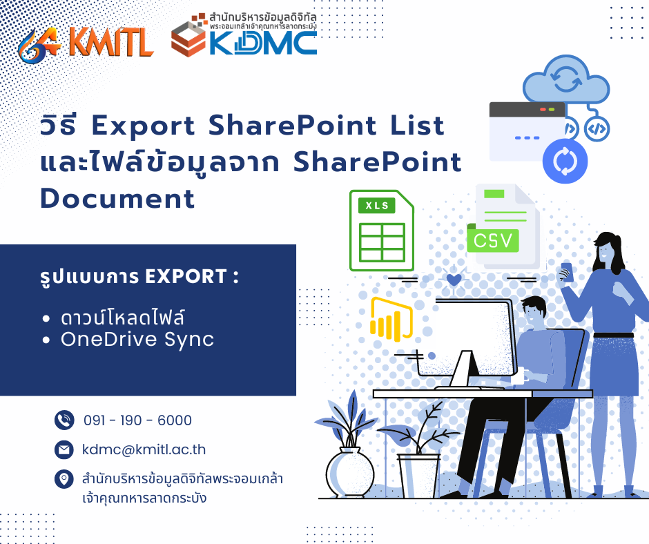 เนื่องจาก Microsoft มีการเปลี่ยนแปลงนโยบายการให้บริการพื้นที่จัดเก็บข้อมูลบน OneDrive ,Outlook และ SharePoint นักศึกษาและศิษย์เก่าจึงจำเป็นต้องย้ายข้อมูลออกจากระบบเพื่อป้องกันความเสียหายต่อข้อมูล บทความนี้จึงขอแนะนำวิธีการนำข้อมูลออกจาก SharePoint Online ในส่วนของ SharePoint List และ SharePoint Document