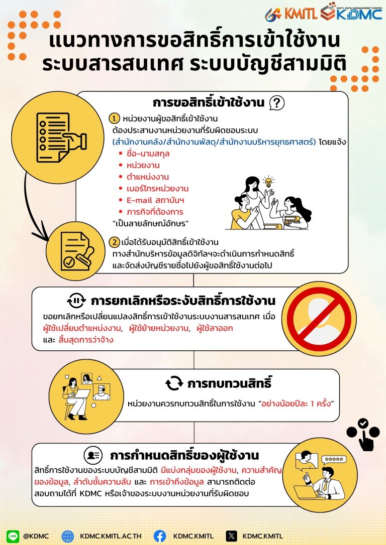 แนวทางการขอสิทธิ์การเข้าใช้งานระบบสารสนเทศ ระบบบัญชีสามมิติข่าวประชาสัมพันธ์, องค์ความรู้ สำนักบริหารข้อมูลดิจิทัลพระจอมเกล้าเจ้าคุณทหารลาดกระบัง ขอแจ้งแนวทางการขอสิทธิ์การเข้าใช้งานระบบสารสนเทศ ระบบบัญชีสามมิติ เพื่อให้บุคลากรผู้มีส่วนเกี่ยวข้องในการใช้งานระบบสารสนเทศของสถาบัน ระบบบัญชีสามมิติ มีความเข้าใจในการบริหาร จัดการสิทธิ์ของผู้ใช้งานในระบบงานบัญชีสามมิติ ตามสิทธิ์ที่ได้รับมอบหมาย และสร้างความตระหนักรู้ถึงความสำคัญของการรักษาความมั่นคงปลอดภัยของระบบสารสนเทศของสถาบัน updated on 11 July 2024