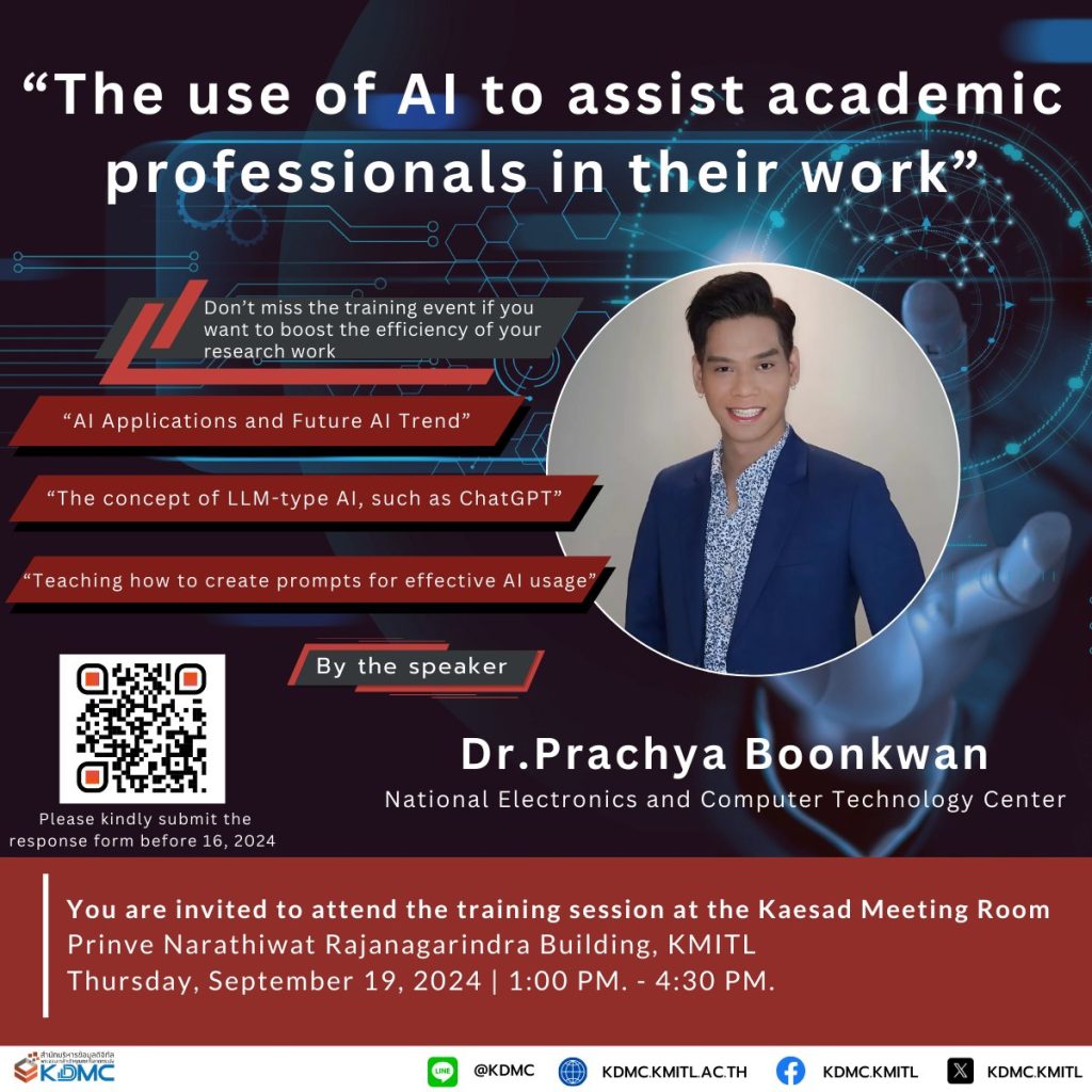 อยากเพิ่มประสิทธิภาพในการทำงานวิจัย ห้ามพลาด ! กับกิจกรรมการอบรม “การใช้ AI เพื่อช่วยในการทำงาน สำหรับบุคลากรสายวิชาการ” วันพฤหัสบดีที่ 19 กันยายน 2567 เวลา 13.00 – 16.30 น. ณ ห้องประชุมแคแสด อาคารกรมหลวงนราธิวาสราชนครินทร์ สจล. โดย ดร.ปรัชญา บุณขวัญ นักวิจัยชื่อดังจากเนคเทค มาเผยเคล็ดลับการใช้ AI มาประยุกต์ใช้ในการทำงานวิจัยให้มีประสิทธิภาพยิ่งขึ้น ขอความกรุณาส่งแบบฟอร์มตอบรับภายในวันจันทร์ที่ 16 กันยายน 2567 สอบถามข้อมูลเพิ่มเติมได้ที่ Line ID : @kdmc
