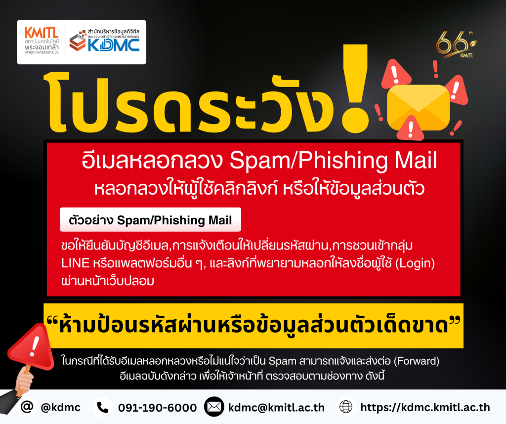 📌 หากพบอีเมลที่น่าสงสัยสามารถแจ้งและส่งต่อ (Forward) อีเมลฉบับดังกล่าว มาที่ kdmc@kmitl.ac.th เพื่อให้เจ้าหน้าที่ตรวจสอบและดำเนินการต่อไป