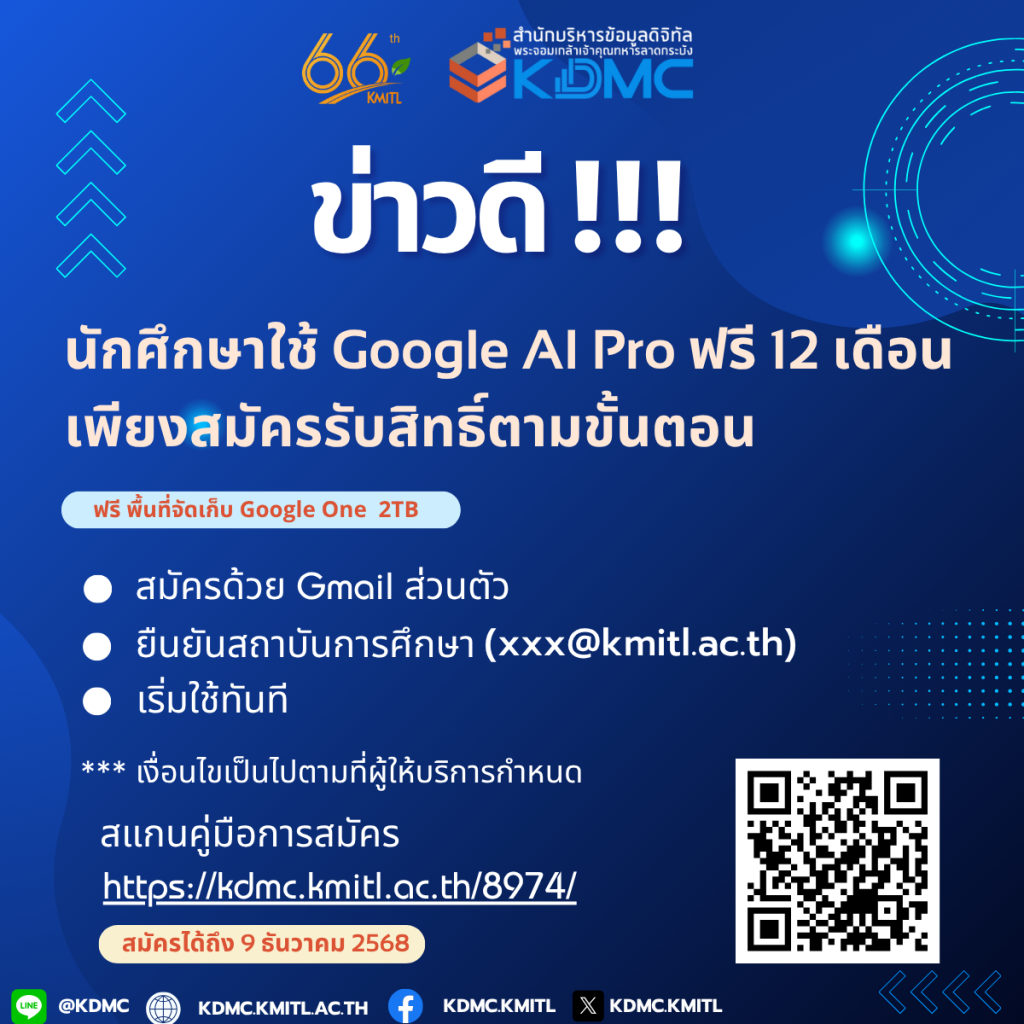 ขั้นตอนการสมัครใช้ Google AI Pro (Gemini) ฟรี 1 ปี (สำหรับนักศึกษา และบุคลากร) อ่านรายละเอียด »
