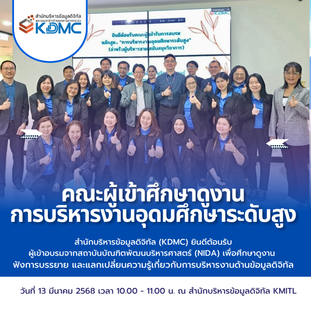 สำนักบริหารข้อมูลดิจิทัล (KDMC) ให้การต้อนรับผู้เข้าอบรมจากสถาบันบัณฑิตพัฒนบริหารศาสตร์ (NIDA) โครงการหลักสูตร “การบริหารงานอุดมศึกษาระดับสูง” (สำหรับผู้บริหารสายสนับสนุนวิชาการ)