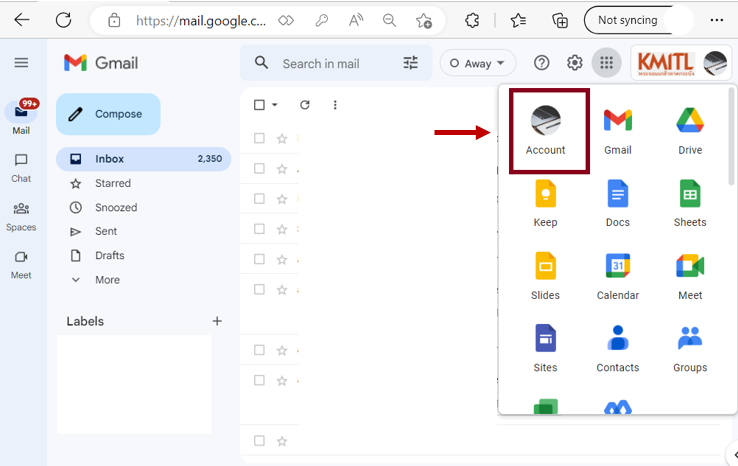 1. เมื่อ Login อยู่ที่หน้า gmail สถาบันแล้ว ให้คลิกที่แผง Google apps มุมขวา จากนั้นคลิกที่ Account หรือคลิก https://myaccount.google.com/ เพื่อเข้าสู่หน้า Google Account