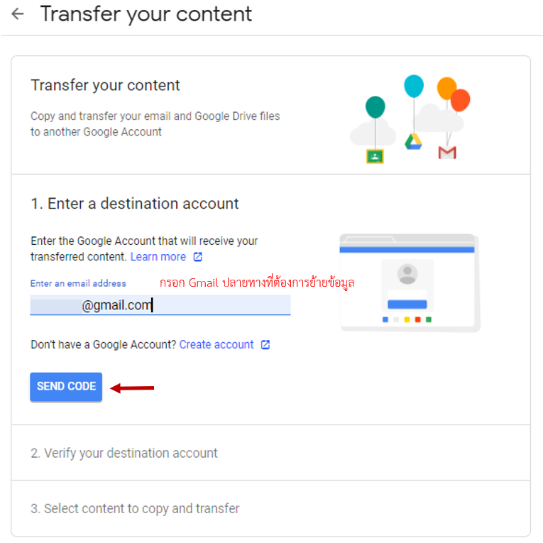 3. กรอกอีเมล์ปลายทางที่ต้องการย้ายข้อมูล จากนั้นคลิก SEND CODE ด้านล่าง