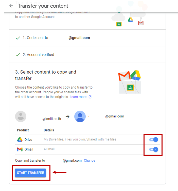 5. เมื่อผ่านการ ยืนยันอีเมล์ปลายทางแล้ว ระบบจะให้เลือกการคัดลอก 2 product คือ Google Drive และ Gmail หากไม่ต้องการคัดลอก product ไหน ก็ให้ คลิกบริเวณกรอบสีแดงจากสีฟ้าให้เป็นสีเทา ทั้งนี้ ต้องมั่นใจว่า พื้นที่ปลายทางเพียงพอต่อปริมาณข้อมูลจากต้นทางที่จะทำการคัดลอกไป เมื่อเสร็จสินการเลือกแล้ว ให้คลิก START TRANSFER จากนั้นเมื่อระบบคัดลอก ข้อมูลเรียบร้อยแล้ว ระบบจะอีเมล์แจ้งเตือนไปยังอีเมล์ปลายทาง ซึ่งระยะเวลาในการคัดลอกข้อมูลขึ้นอยุ่กับปริมาณข้อมูลด้วย