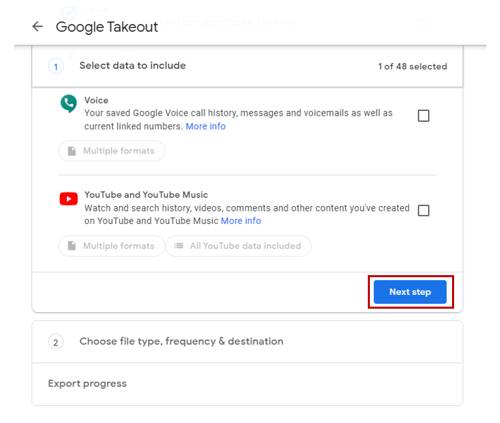 3. เมื่อเลือกข้อมูลที่จะดาวน์โหลดเสร็จแล้ว ให้เลื่อนลงมาด้านล่างสุดจนเจอปุ่ม Next step และคลิกที่ปุ่ม