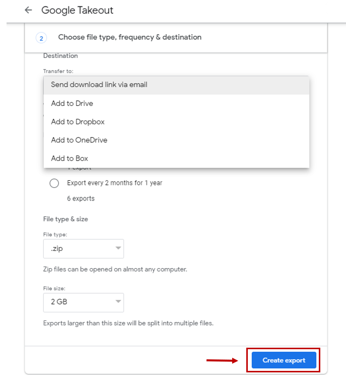 4.จากนั้น เลือกปลายทางที่ต้องการจะดาวน์โหลดข้อมูลไปเก็บไว้ เลือกประเภทไฟล์ที่ดาวน์โหลด (File type) ขนาดไฟล์ที่จะทำการดาวน์โหลด (File size) จากนั้นคลิก Create export ระบบจะทำการรวบรวมไฟล์แล้วส่งไปยังปลายทางที่ได้ทำการเลือกไว้ก่อนหน้านี้