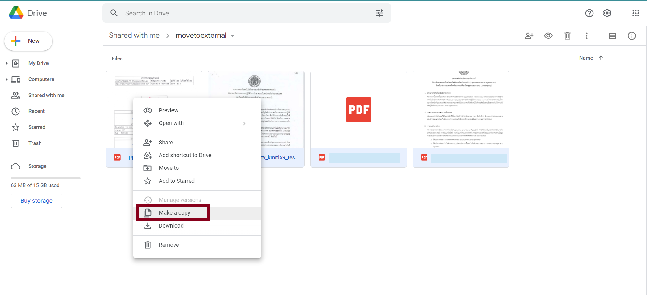 4. ตรวจสอบการแชร์ที่อีเมล์ปลายทาง คลิกเปิดไฟล์ที่ได้รับแชร์ จากนั้นเลือกไฟล์ทั้งหมดและคลิกขวา จากนั้นคลิกเลือก Make a copy