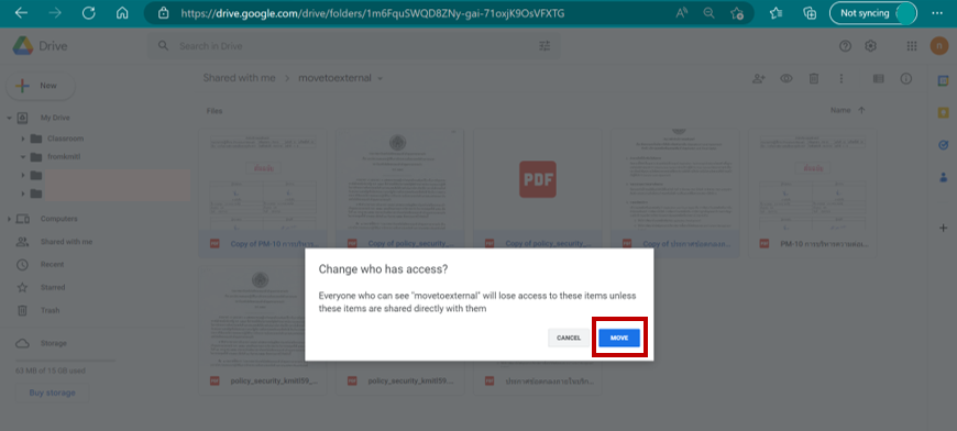 6. จากนั้นระบบจะแจ้งสิทธิ์การเปลี่ยนแปลงในการเข้าถึงไฟล์ ให้คลิก move ถือว่าเป็นการคัดลอกไฟล์เรียบร้อยแล้ว เมื่อต้นทางปิดการแชร์สิทธิ์ ไฟล์ที่คัดลอกมาจะยังคงสามารถเข้าถึงได้