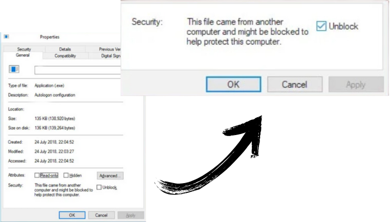 คลิกขวาที่ไฟล์ที่ไม่สามารถเปิดใช้งานได้ จากนั้นไปที่ properties --> คลิก General Tab --> เลื่อนลงมาด้านล่าง จนพบข้อความในหัวข้อ Security : “This file originates from another computer and might be blocked to help safeguard this computer.” ให้ผู้ใช้งาน Unselect ในตัวเลือก Unblock ตามภาพด้านล่างนี้