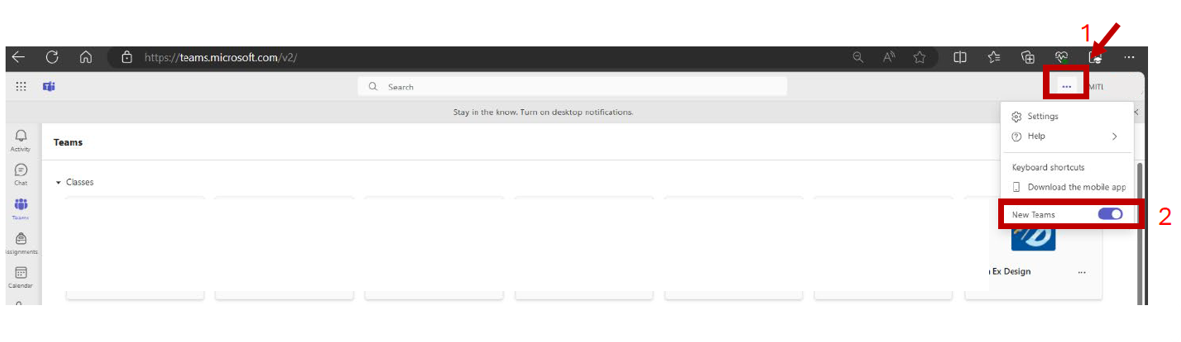ปัจจุบันนี้หากผู้ใช้งานมีการเข้าใช้งาน Microsoft Teams ระบบจะบังคับให้เปลี่ยนจาก Microsoft Teams Classic เป็น New Teams โดยอัตโนมัติ หากผู้ใช้งานต้องการเปลี่ยนกลับมาใช้งานในเวอร์ชันเดิม สามารถทำได้ โดยคลิกที่ more option บริเวณมุมขวาบน จากนั้นคลิกปิด New Teams ดังภาพด้านล่าง