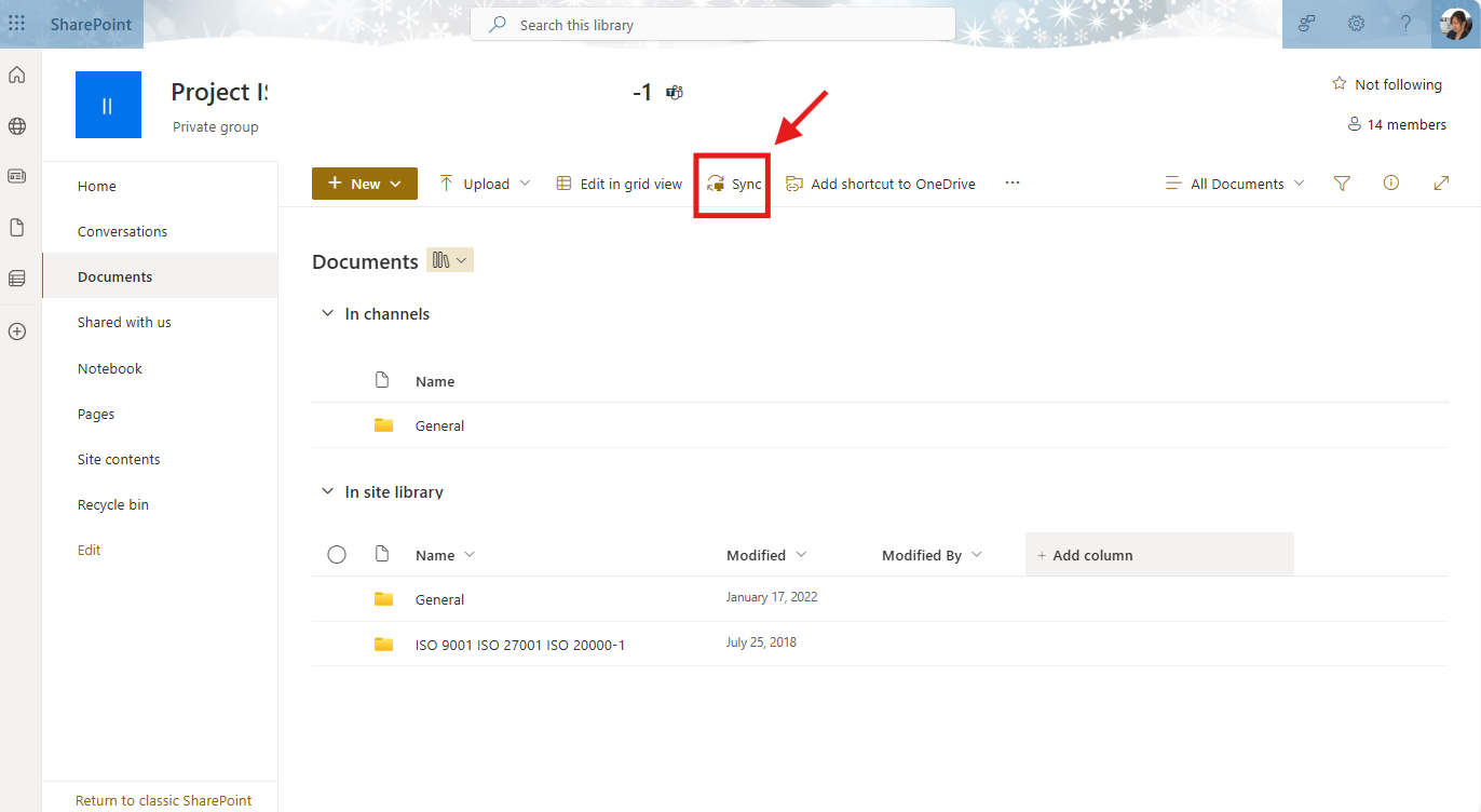 เครื่องที่ผู้ใช้งานต้องการ Sync จำเป็นต้องติดตั้ง OneDrive ก่อนเริ่ม Sync  หลังจากติดตั้ง OneDrive แล้ว ให้ไปที่เมนู Document  ที่ต้องการ Sync จากนั้นคลิกเมนู Sync ดังภาพด้านล่าง