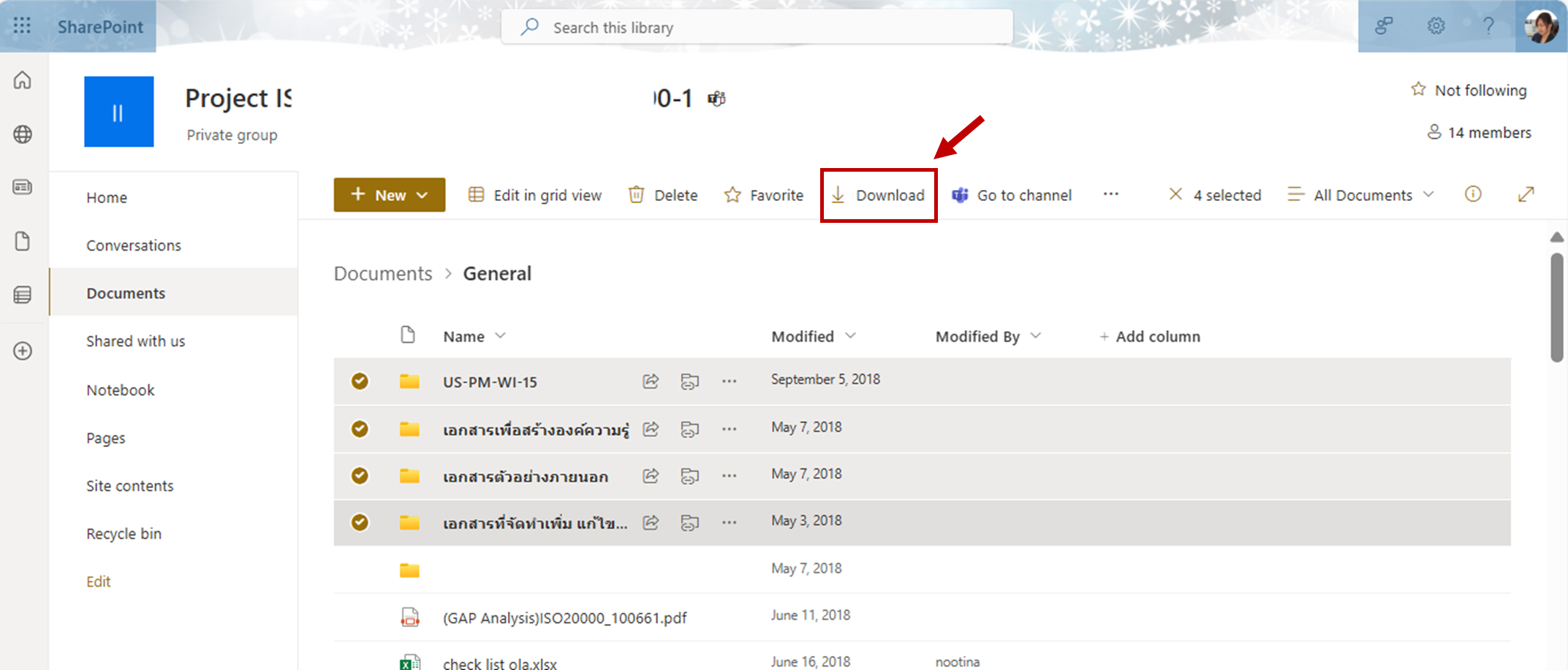 เมื่อเข้าสู่  Document Library  SharePoint Site ที่ต้องการ export แล้วให้ เลือกไฟล์หรือโฟลเดอร์ ที่ต้องการ export (สามารถเลือกได้หลายไฟล์โดยการคลิกเลือกหน้าไฟล์หรือโฟลเดอร์ที่ต้องการ) จากนั้นกดเลือกเมนูดาวน์โหลดด้านบน ตามภาพด้านล่าง