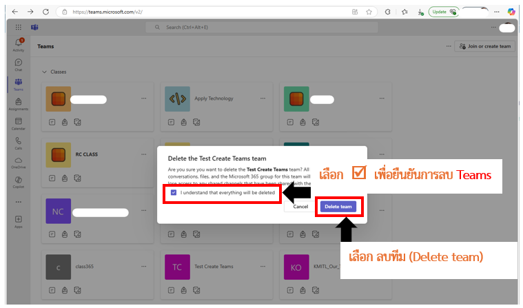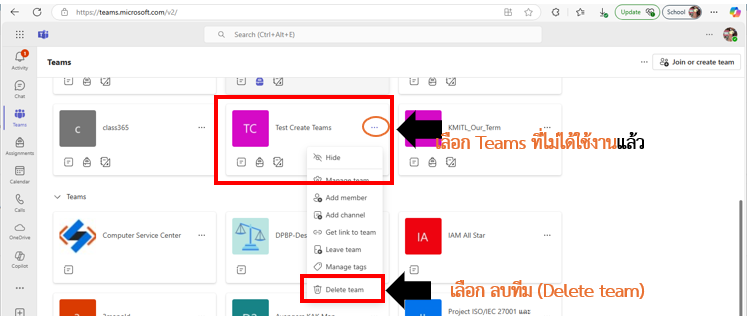 ** เจ้าของ (Owner) Teams เท่านั้นจะสามารถลบได้ โดยทำตามขั้นตอน ดังต่อไปนี้