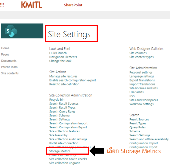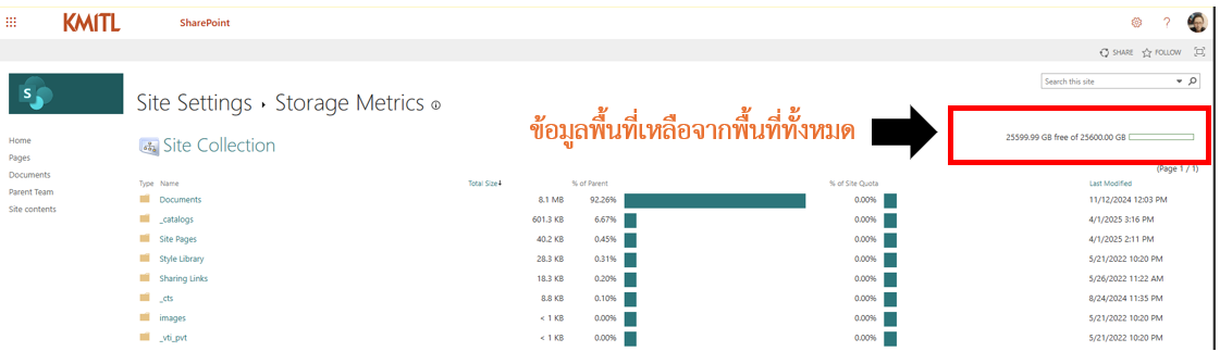 9.เมื่อเข้าสู่หน้า Site Settings, Storage Metrics ให้ทำการคำนวณ โดยพื้นที่ทั้งหมด คือ 25600.00 GB