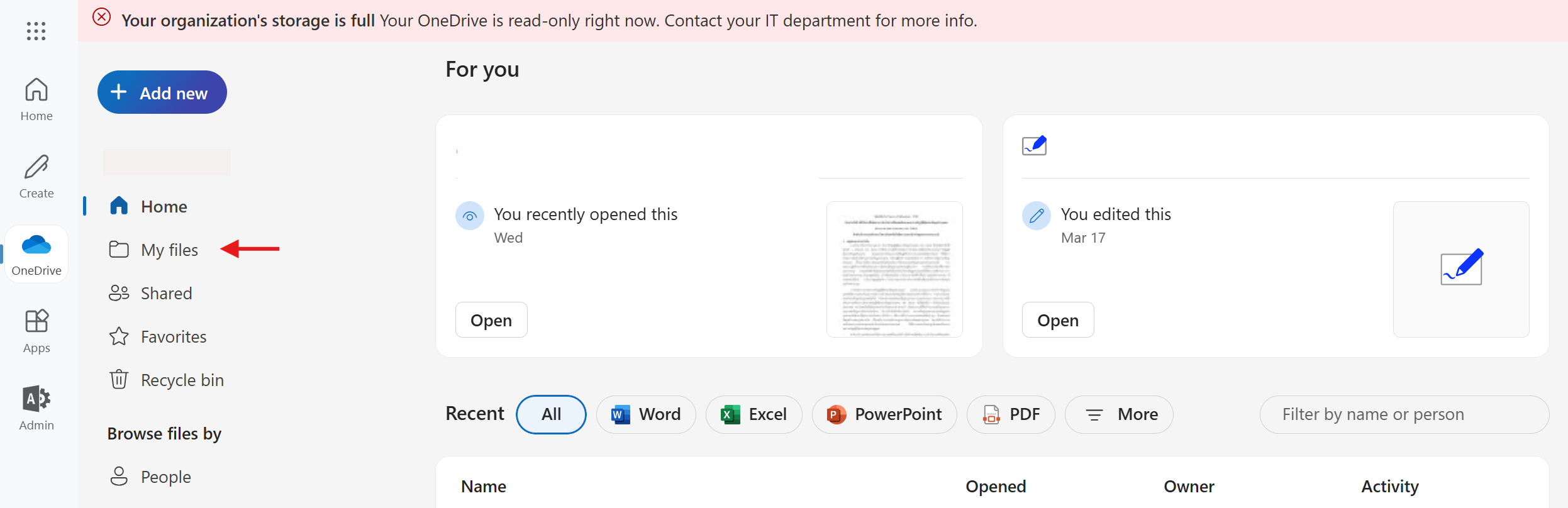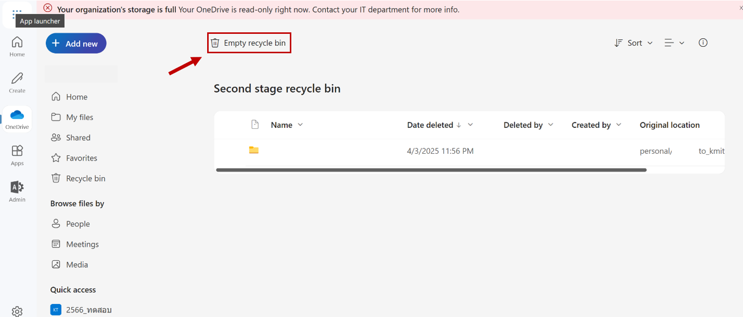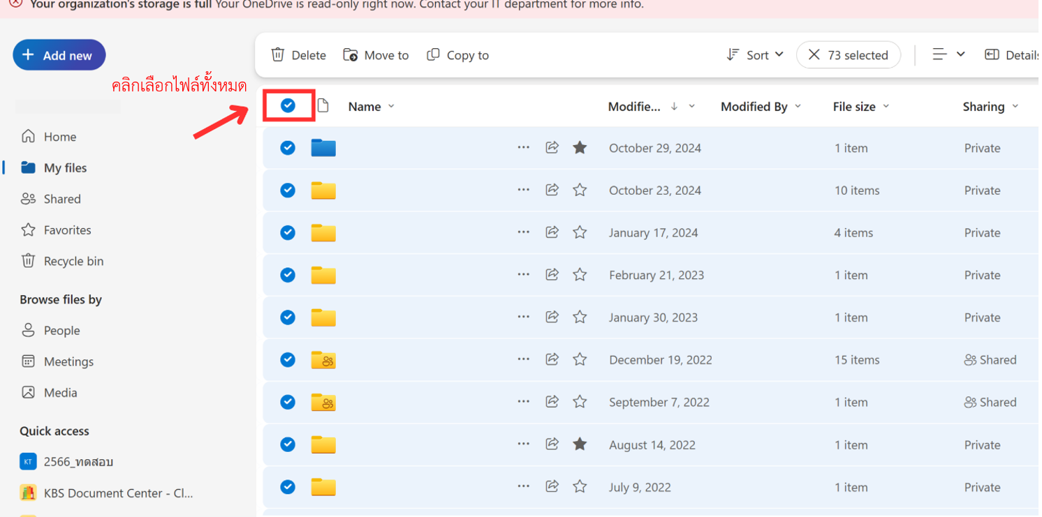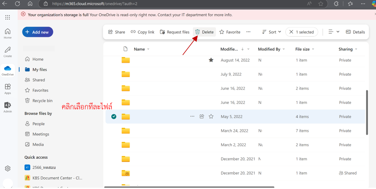 หลังการสำรองไฟล์ที่จำเป็นออกจาก OneDrive แล้วเพื่อให้พื้นที่ไม่เกินโควต้าที่สถาบันกำหนด ควรลบไฟล์ที่ไม่จำเป็นหรือไม่ได้ใช้งานแล้วออกจากพื้นที่ ทั้งในเมนู My files และ Recycle bin ดังนี้