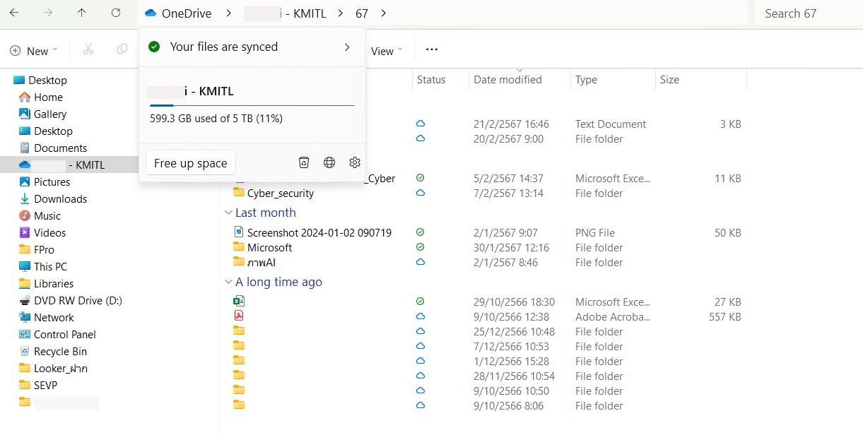 หลังจากตรวจสอบพื้นที่คงเหลือแล้ว สามารถทำการสำรองข้อมูลจาก OneDrive-KMITL ลงเครื่องคอมพิวเตอร์ ได้ดังนี้
