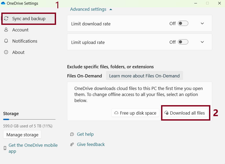 จากนั้นเลือกหัวข้อ Sync and backup และเลื่อนลงไปที่หัวข้อ Advanced setting –> File On-Demand –> Download all files ไฟล์ทั้งหมดจาก OneDrive จะถูกดาวน์โหลดเก็บไว้ยังเครื่องคอมพิวเตอร์