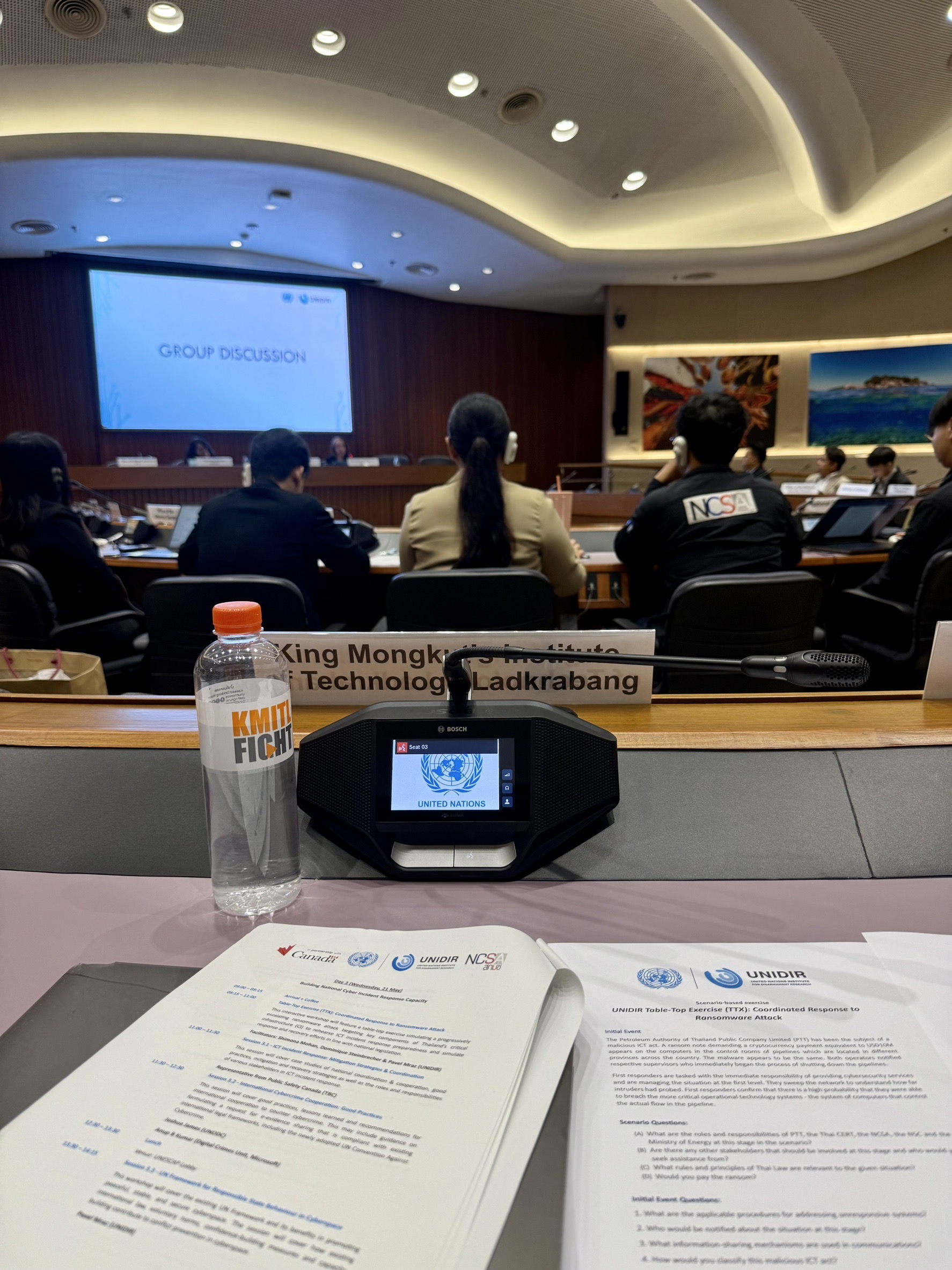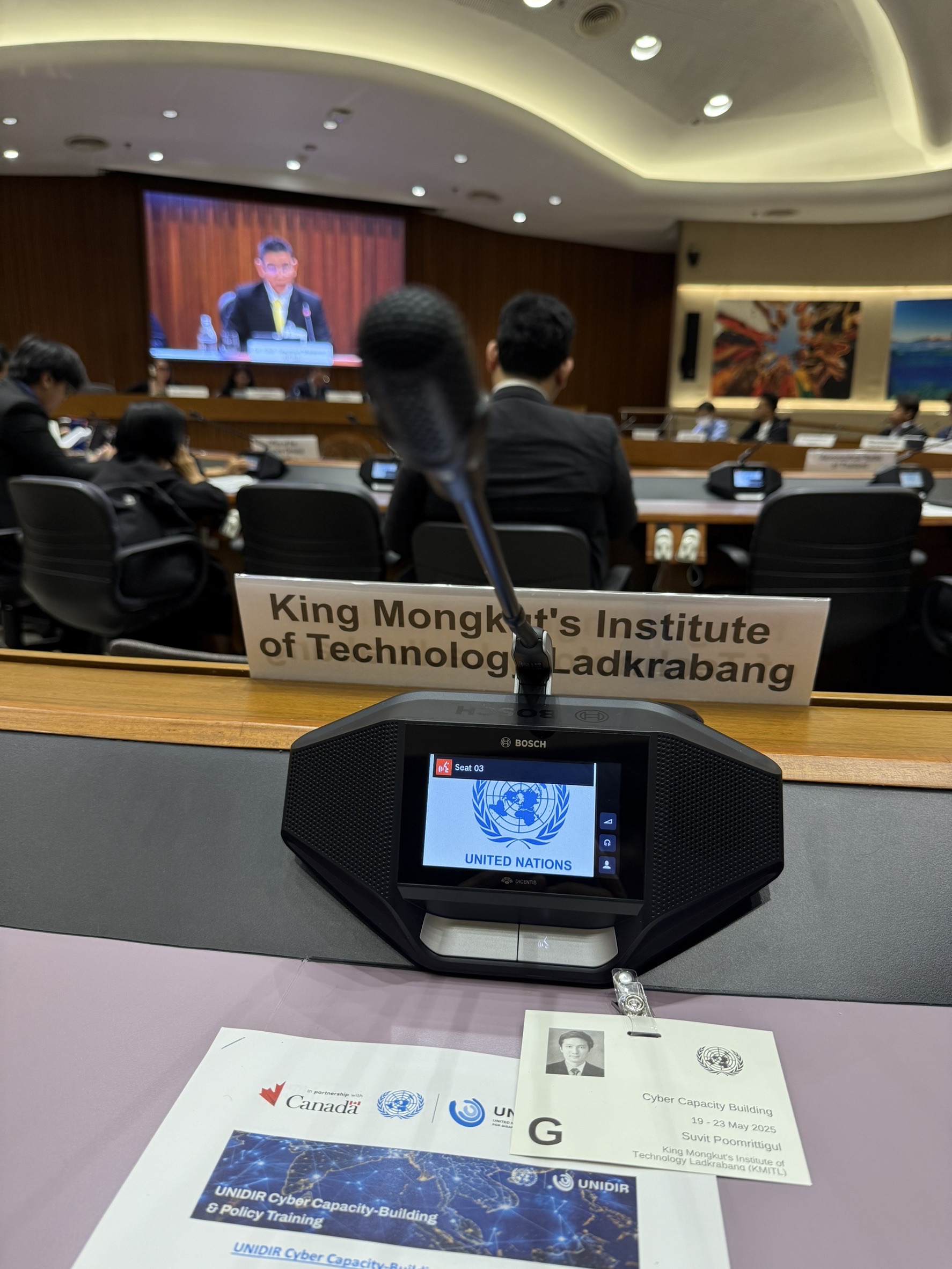 19 – 21 พ.ค. 2568 สจล. ในนาม KDMC ร่วมเข้าอบรมเชิงปฏิบัติการ กับ สกมช. และ UN ผลักดันแนวทางรับมือความเสี่ยงไซเบอร์จากเทคโนโลยีใหม่ ในหัวข้อ   “UNIDIR Cyber Capacity-Building and Policy Training” ณ United Nations Conference Center (UNCC), UNESCAP เพื่อแลกเปลี่ยนองค์ความรู้กับผู้เชี่ยวชาญระดับนานาชาติ ทั้งในด้านการทูตไซเบอร์ ปัญญาประดิษฐ์ คอมพิวเตอร์ควอนตัม ตลอดจนการวิเคราะห์ภัยคุกคามที่พุ่งเป้าไปยังกลุ่มประชากรหลากหลาย ซึ่งล้วนมีบทบาทสำคัญต่อการกำหนดทิศทางด้านความมั่นคงปลอดภัยไซเบอร์ของประเทศไทย โดยเฉพาะในยุคที่โลกกำลังเผชิญกับความเปลี่ยนแปลงอย่างรวดเร็วและซับซ้อน และการยกระดับบริการสาธารณะ และการเพิ่มขีดความสามารถของประเทศอย่างมีนัยสำคัญ