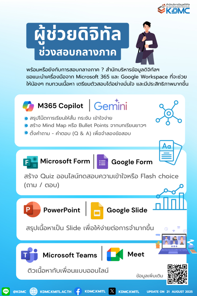 Are you ready for the midterm exams? KMITL Data Management Center (KDMC) introduces tools from Microsoft 365 and Google Workspace to help you review lessons, prepare with confidence, and study more effectively.