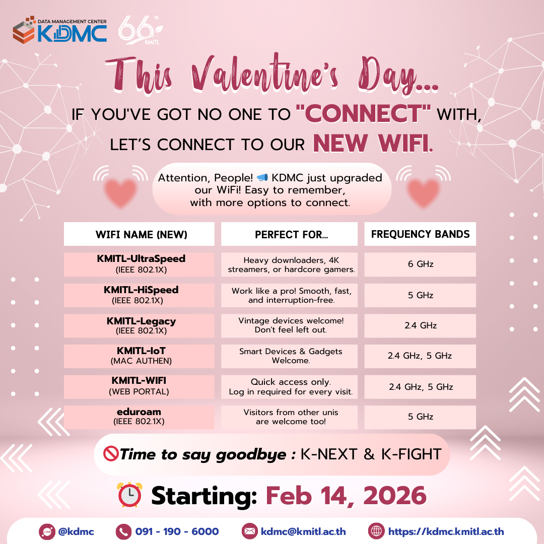 KMITL Data Management Center (KDMC), would like to announce that the institute’s wireless network (Wi-Fi) SSIDs will be renamed to better support modern devices and to reduce confusion when connecting to Wi-Fi. Please find the new SSIDs and recommended usage below: