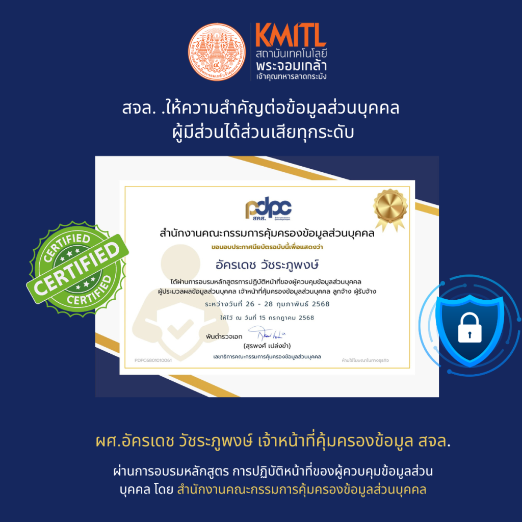 สจล. ให้ความสำคัญต่อข้อมูลส่วนบุคคล ผู้มีส่วนได้ส่วนเสียทุกระดับ ขอแสดงความยินดีกับ ผศ.อัครเดช วัชระภูพงษ์ เจ้าหน้าที่คุ้มครองข้อมูลส่วนบุคคล