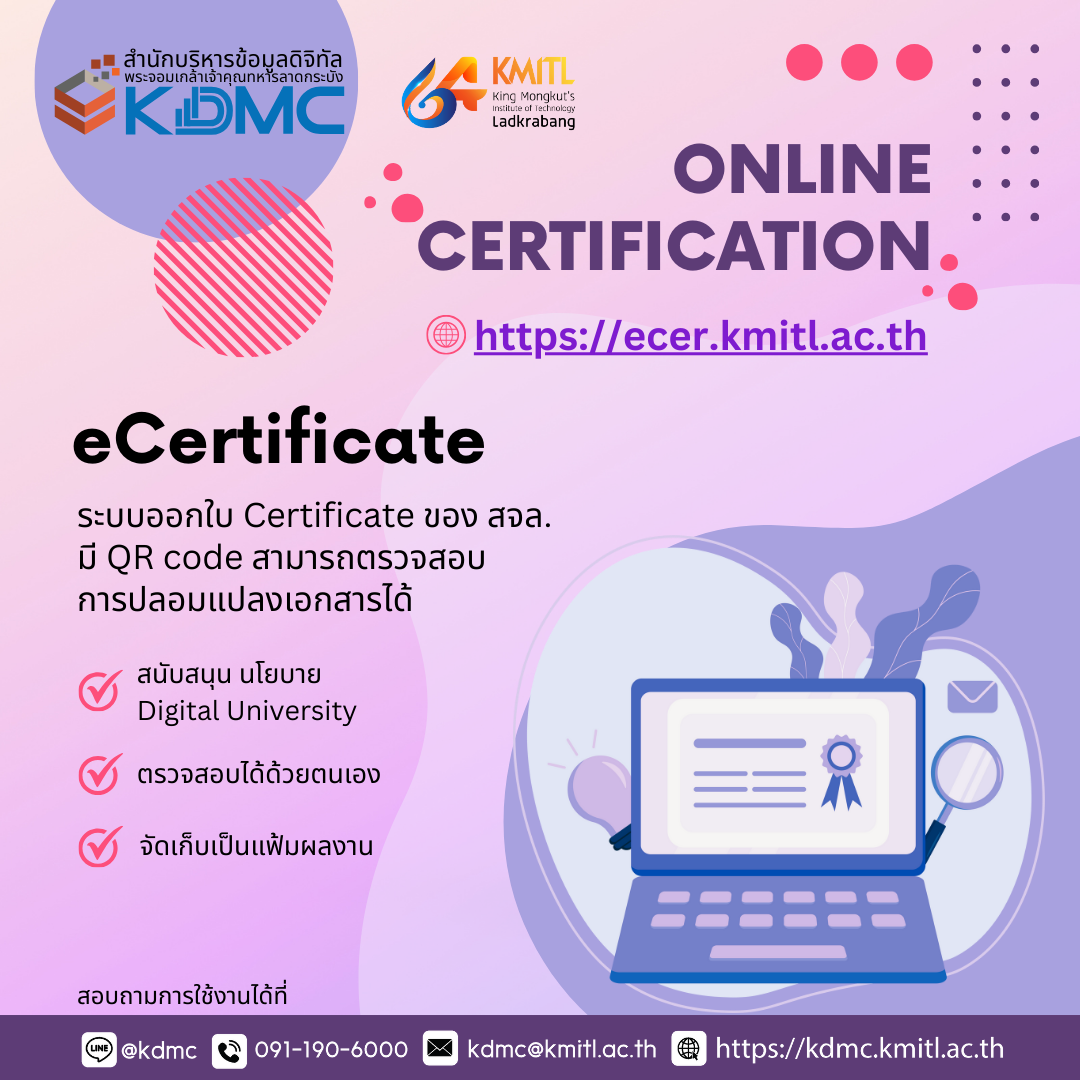 🎓 สำหรับนักศึกษา ผู้เข้าอบรม และผู้เข้าร่วมกิจกรรมต่างๆ ไม่ว่าคุณจะเป็นบุคคลภายในหรือภายนอกสถาบัน ระบบ eCertificate KMITL พร้อมให้บริการคุณแล้ววันนี้!