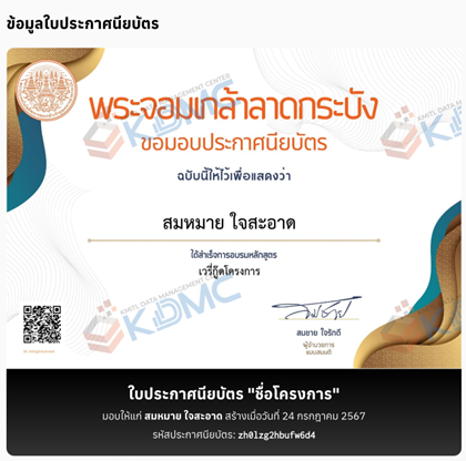เมื่อเว็บไซต์พบใบประกาศนียบัตรบนระบบเว็บไซต์จะแสดงผลรูปภาพสําเนาใบประกาศนียบัตรใบเดียวกัน พร้อมกับแสดงข้อมูลผู้รับ ชื่อโครงการที่ได้รับ ข้อมูลวันที่ออกใบประกาศนียบัตร และข้อมูลอื่น ๆ โดยท่านสามารถตรวจสอบข้อมูลของใบประกาศนียบัตรเพื่อยืนยันความถูกต้องได้