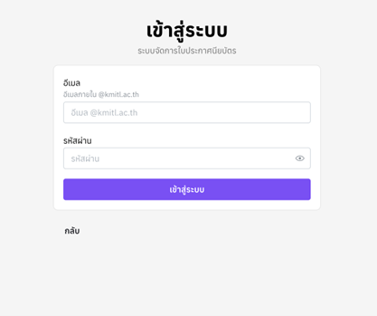 เข้าสู่เว็บไซต์ https://ecer.kmitl.ac.th/internal สําหรับเข้าสู่ระบบเว็บไซต์เพื่อออกใบ ประกาศนียบัตร และใช้บัญชี KMITL Account v2 ในการเข้าสู่ระบบ หากลืมรหัสผ่าน ท่านสามมารถเข้า เว็บไซต์ https://iam.kmitl.ac.th/ เพื่อเปลี่ยนรหัสผ่าน หรือติดต่อสํานักบริหารข้อมูลดิจิทัลเพื่อดําเนินการ สร้างรหัสผ่านสําหรับเข้าสู่ระบบใหม่